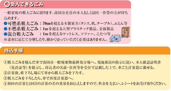 南国市の一般家庭から排出される粗大ごみで、一定のサイズ以上のものが受け入れ可能となります。
